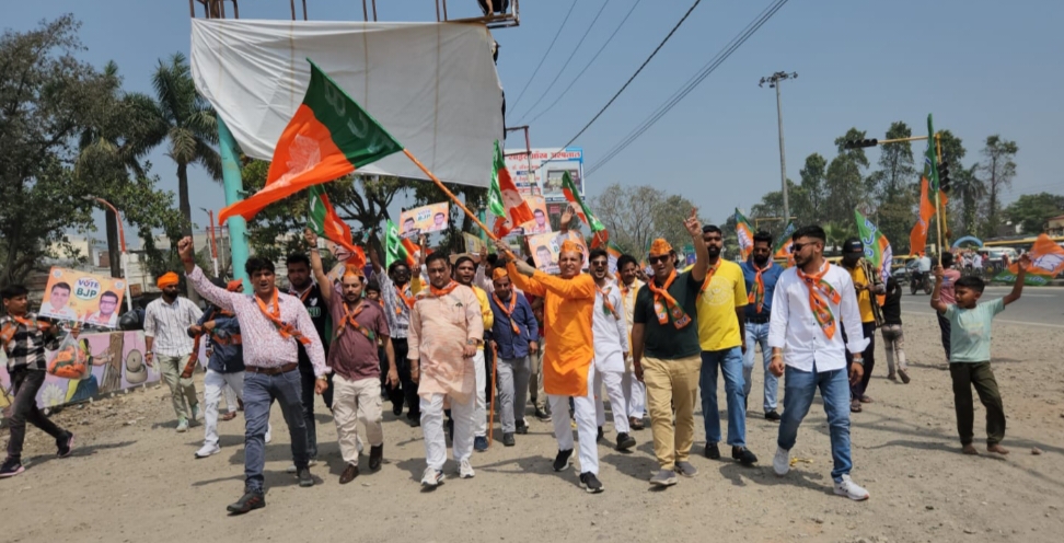 रुद्रपुर. पार्षद सचिन मुंजाल एवम जिला सह संयोजक सुशील गाबा सहित मलिक कॉलोनी एलायंस कॉलोनी वार्ड 31 से दर्जनों क्षेत्रवासी आज भाजपा लोकसभा प्रत्याशी अजय भट्ट के नामांकन कार्यक्रम मेंट्रेक्टर, चौपहिया एवम दोपहिया वाहनों के काफिले के साथ पूरे जोशखरोश में नारेबाजी करते हुए पहुंचे। पूरी रैली में सबसे बड़ा झंडा थामे सुशील गाबा की जबरदस्त एनर्जी और जुनून के हजारों भाजपा कार्यकर्ता पहली बार गवाह बने। पार्षद सचिन मुंजाल ने भी जोरदार नारेबाजी की।