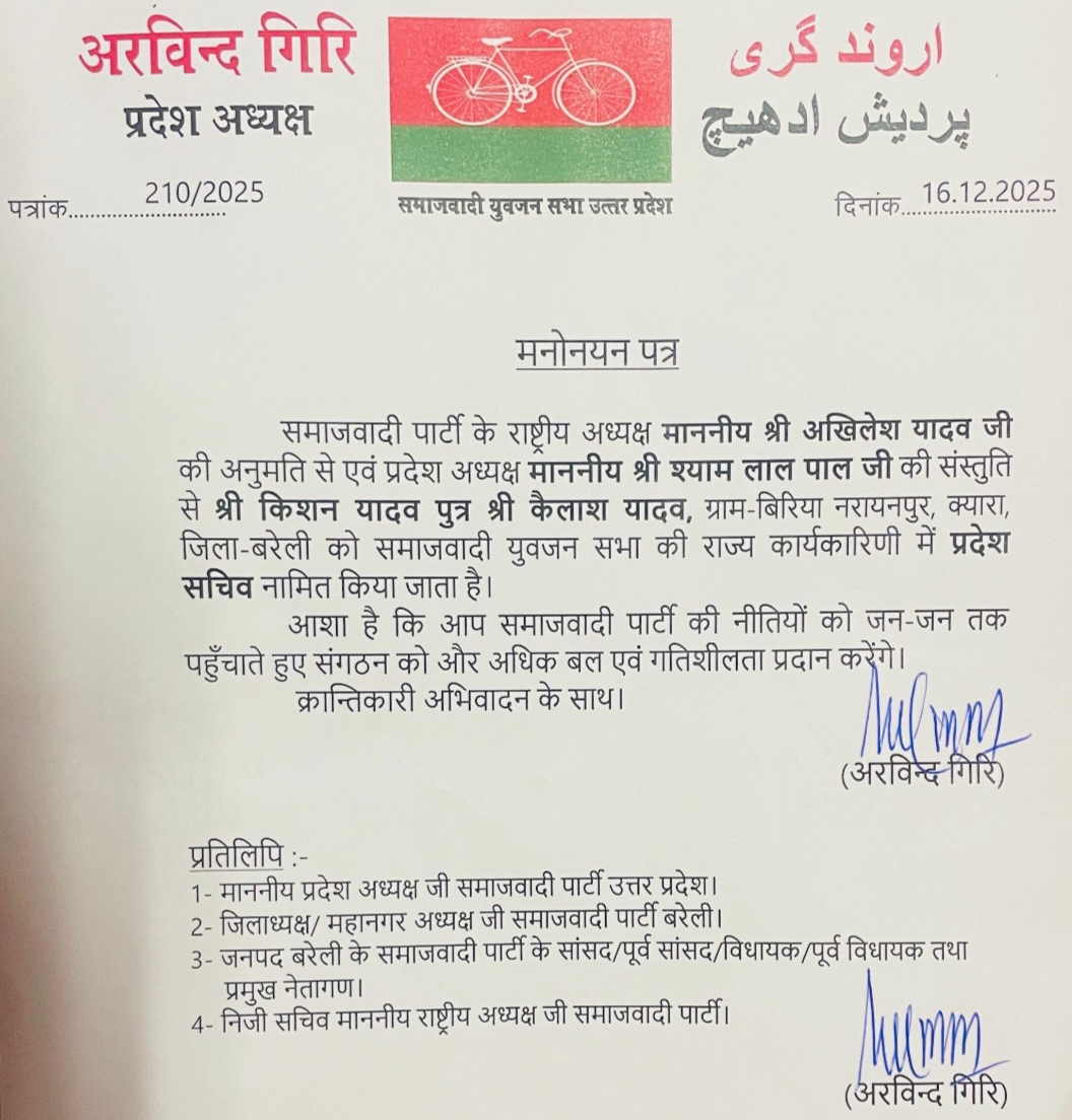 बरेली। समाजवादी पार्टी के राष्ट्रीय अध्यक्ष अखिलेश यादव की अनुमति एवं प्रदेश अध्यक्ष माननीय श्याम लाल पाल की संस्तुति से किशन यादव पुत्र कैलाश यादव, निवासी ग्राम बिरिया नारायणन, क्यारा को समाजवादी पार्टी का प्रदेश सचिव नामित किया गया है। उनकी इस महत्वपूर्ण नियुक्ति से पार्टी कार्यकर्ताओं में उत्साह और हर्ष का माहौल है। प्रदेश सचिव बनाए जाने पर किशन यादव को पार्टी के वरिष्ठ नेताओं एवं कार्यकर्ताओं ने शुभकामनाएं देते हुए इसे संगठन के लिए मजबूती प्रदान करने वाला कदम बताया।