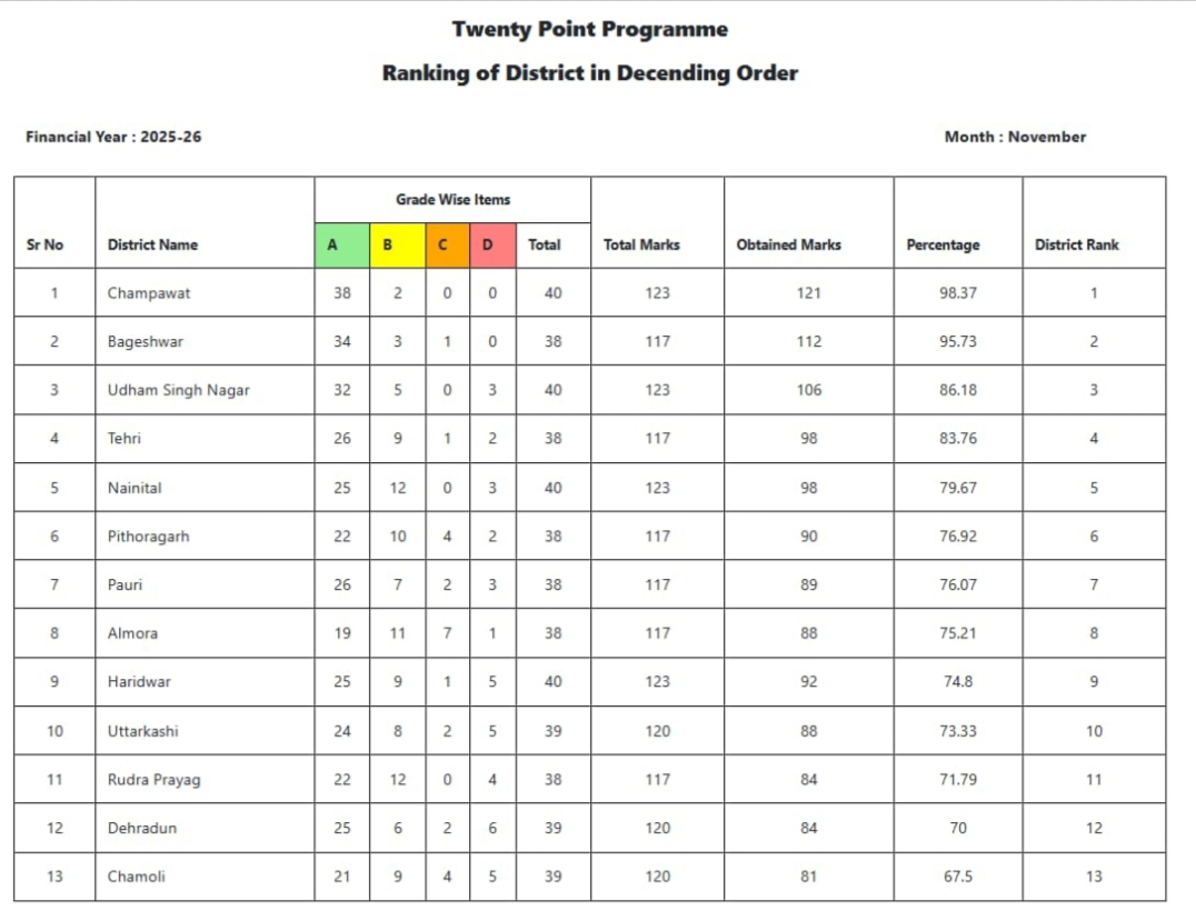मुख्यमंत्री श्री पुष्कर सिंह धामी के मार्गदर्शन एवं निर्देशों के अनुरूप तथा जिलाधिकारी श्री मनीष कुमार के नेतृत्व, प्रभावी समन्वय एवं सतत अनुश्रवण के परिणामस्वरूप जनपद चम्पावत ने भारत सरकार के बीस सूत्रीय कार्यक्रम के क्रियान्वयन में नवंबर माह की रैंकिंग में भी प्रदेश स्तर पर प्रथम स्थान प्राप्त किया है। इस उपलब्धि के साथ जनपद ने एक बार फिर उत्कृष्ट प्रशासनिक कार्यप्रणाली का परचम लहराया है।