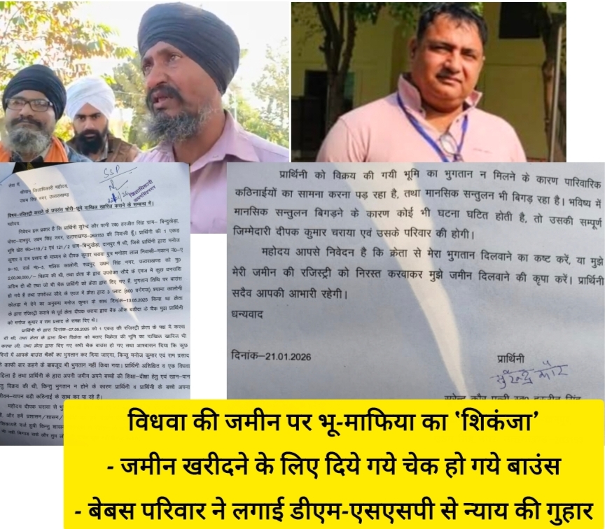 रुद्रपुर। क्षेत्र में जमीन की धोखाधड़ी का एक सनसनीखेज मामला सामने आया है, जहाँ एक बेसहारा विधवा महिला की बेशकीमती जमीन को जालसाजी के जरिए हड़पने का गहरा ताना-बना बुना गया बिन्दुखेड़ा निवासी सुरेन्द्र कौर ने जिलाधिकारी और वरिष्ठ पुलिस अधीक्षक को सौंपे शिकायती पत्र में सनसनीखेज आरोप लगाते हुए बताया कि प्रॉपर्टी डीलर ने न केवल उसे फर्जी चेक थमाकर ठगी की, बल्कि शासन-प्रशासन में अपनी ऊंची पहुंच का रौब दिखाकर उसे मानसिक रूप से प्रताड़ित भी किया जा रहा है।