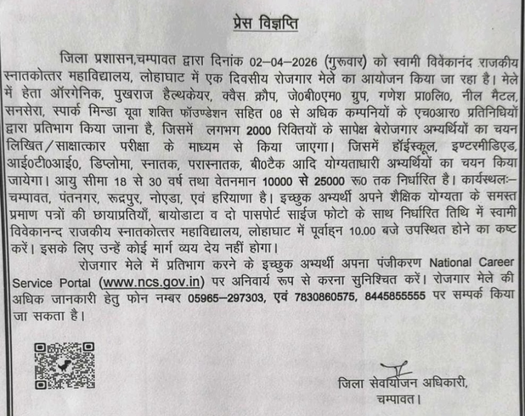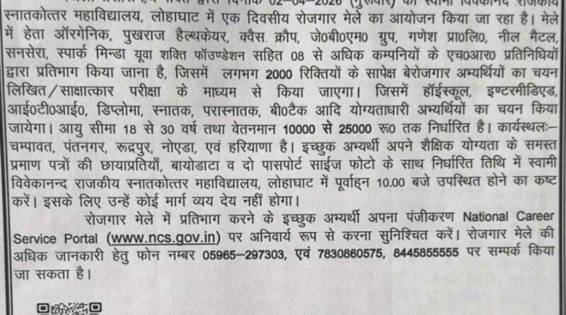 चम्पावत। जनपद के युवाओं के लिए रोजगार पाने का सुनहरा अवसर आने वाला है। जिला प्रशासन की ओर से 02 अप्रैल 2026 (गुरुवार) को लोहाघाट में एक दिवसीय भव्य रोजगार मेले का आयोजन किया जा रहा है। यह मेला स्वामी विवेकानंद राजकीय स्नातकोत्तर महाविद्यालय परिसर में आयोजित होगा, जहां लगभग 2000 रिक्त पदों पर सीधी भर्ती की जाएगी।