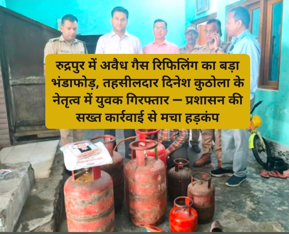 रुद्रपुर में अवैध गैस रिफिलिंग का बड़ा भंडाफोड़, तहसीलदार दिनेश कुटौला के नेतृत्व में युवक गिरफ्तार — प्रशासन की सख्त कार्रवाई से मचा हड़कंप