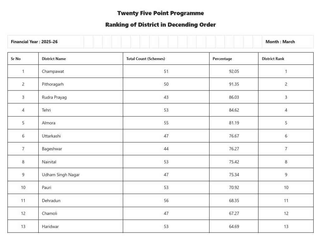 जारी रैंकिंग के अनुसार, चम्पावत ने 51 योजनाओं में उत्कृष्ट प्रदर्शन करते हुए 92.05 प्रतिशत अंक अर्जित किए। वहीं, पिथौरागढ़ जनपद 50 योजनाओं में 91.35 प्रतिशत अंकों के साथ द्वितीय स्थान पर तथा रुद्रप्रयाग जनपद 43 योजनाओं में 86.03 प्रतिशत अंकों के साथ तृतीय स्थान पर रहा।
